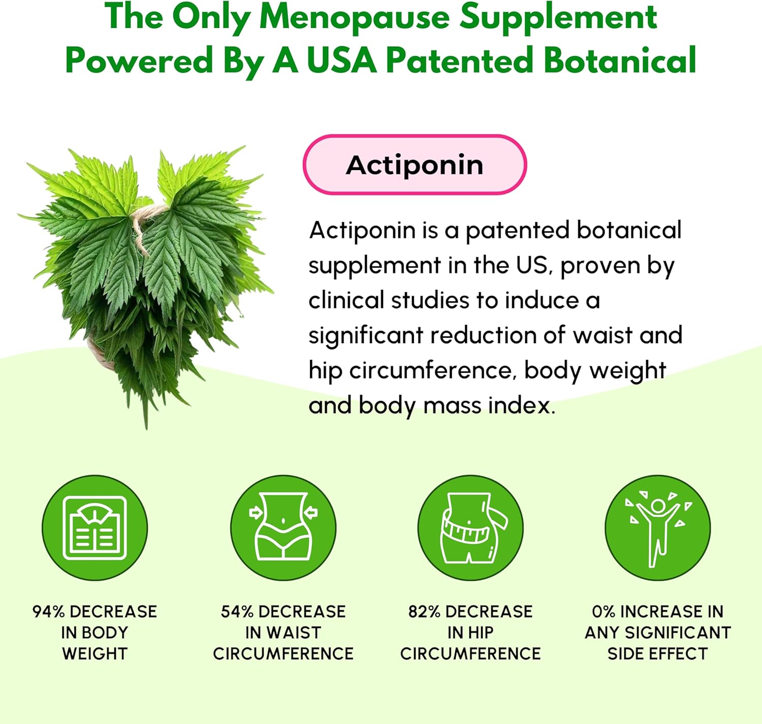 Powered By USA Patented Botanical – MenoSlim Advanced is the only menopause supplement for women containing Actiponin, a clinically studied, USA patented botanical that helps reduce body weight, waist, & hip circumference by mimicking the effects of exercise.